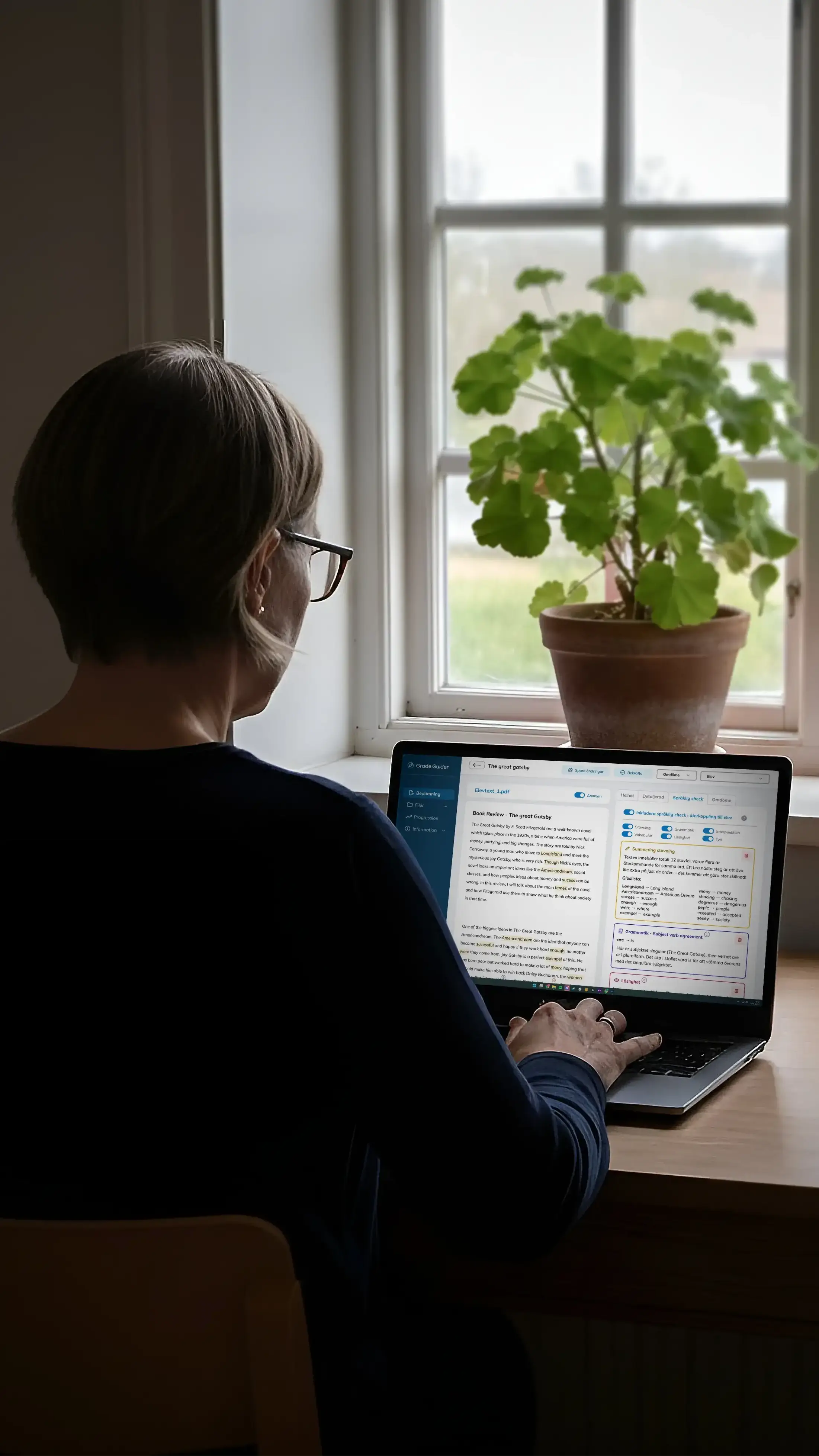 Verktyget analyserar elevens text utifrån flera språkliga aspekter. Det upptäcker stavfel och grammatiska fel, ger förslag på mer varierat ordförråd och bedömer textens läsbarhet. Även interpunktion och ton granskas för att säkerställa att språket är tydligt och anpassat till texttypen.