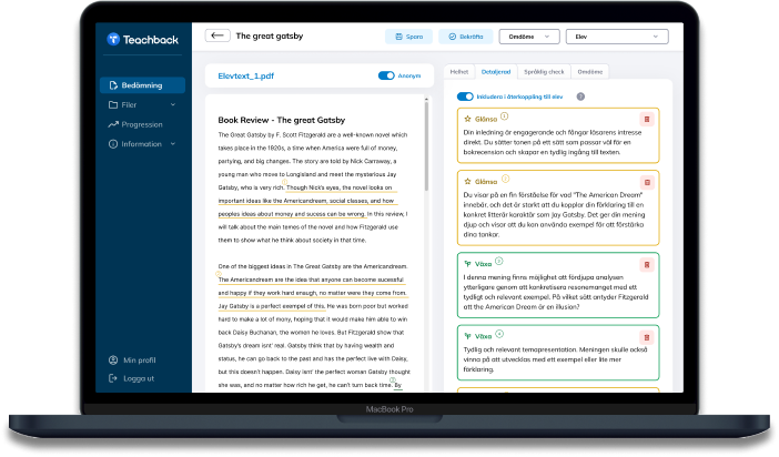 Teachback är en AI-assistent för svensk- och engelsklärare som analyserar elevtexter utifrån Skolverkets kriterier. Den ger personlig feedback och förbättringsstrategier som effektiviserar bedömningen, höjer kvaliteten på den formativa återkopplingen – och frigör tid för det som verkligen betyder något.